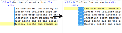 - If only a single line of text data containing no linefeeds is on the clipboard and either a column selection has been made or a Column Insert Line has been drawn (see Typing with Column Selections below), pasting will cause the clipboard contents to be pasted on each line. For example, the following image shows the result of pasting the text "<LI>" when a Column Insert Line has been made: