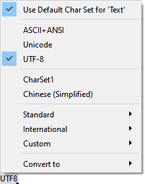 If the current file contains a Byte-Order Mark (BOM) this panel will contain '+B' after the character set name. The character set list and the text displayed in the status bar for each character set can be modified using the Character Set Options dialog. Left-clicking on this panel displays the 'View > Character Set' menu with the addition of a Convert to menu which can be used to quickly convert the character set to other recently used character sets. Clicking the More menu option at the bottom of the Convert to menu brings up the Convert dialog box.